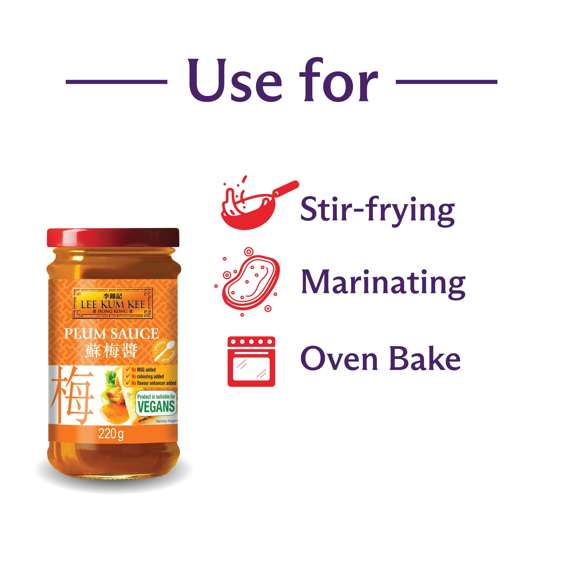 Lee Kum Kee Plum Sauce is a fruity sauce, perfect to use as a dipping sauce for roast duck and finger foods. It can also be used as a glaze for roast meats, cooking sauce in stir fries, dressing for salad, and even as an ingredient for dessert!