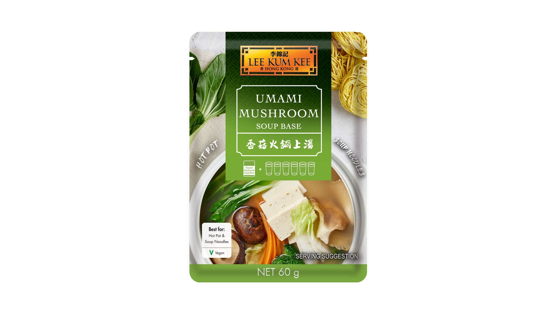 Allergens in bold. Water, Salt, Dried Glucose Syrup, Sugar, Yeast Extract, Flavour Enhancers (E621, E631, E627), Flavouring, Stabiliser [E415 (Soybeans, Wheat)], Colour (E150a), Shiitake Powder 0.2%, White Button Mushroom Powder 0.1%, Spice.